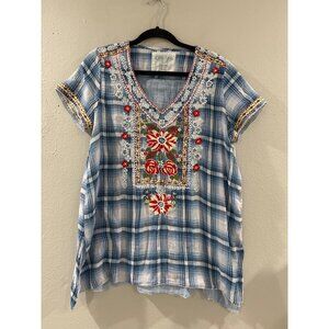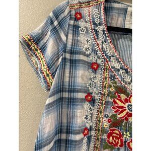 Kyla Seo blue white plaid floral embroidered short sleeve boho tunic shirt large