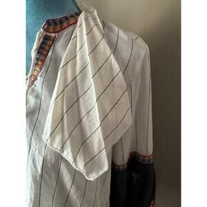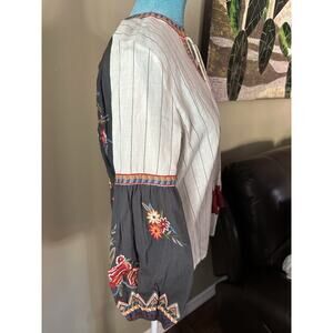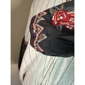 Kayla Seo, size small peasant boho-chic and Aztec style influences . The beautiful artistry of Kayla Sero in this lightweight inspired intricate embroidery! This has a small handkerchief made of the same material attached - never worn. Gorgeous floral and aztec - western type patterns!! And look at the bell sleeves - around the wrist is an intricate pattern. Truly a living piece on of beautifully flowing flattering artistry. Thank you for your consideration.