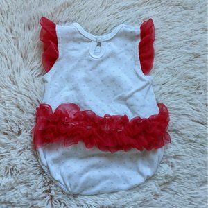 White, sleeveless one-piece with red tulle, wraparound ruffles, tulle cap sleeves, center snaps.