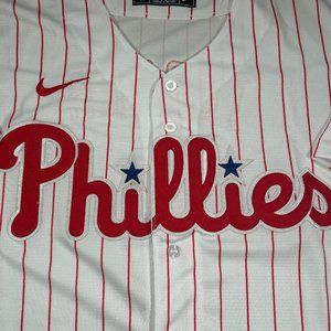 Show your support for the Philadelphia Phillies with this Alec Bohm pinstriped stitched jersey. Made in Indonesia, this men's large jersey is perfect for any baseball fan. The jersey features the team's colors of white and blue, as well as Alec Bohm's name and number on the back. Perfect for regular season games, this jersey is a must-have for any Philadelphia Phillies fan. Whether you're watching the game at home or in the stands, this jersey will make you stand out. Get your hands on this high-quality, officially licensed product today.