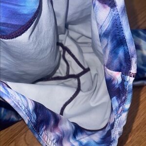 Stylish leggings with a blue and purple tie-dye pattern. Ideal for yoga or casual outings. Has a zipper pocket in the back. Stretchy. Details shown in pictures. Beautiful abstract print. Active wear. In good to new condition.