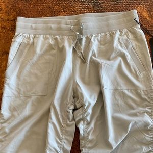 Kyodan Lightweight Activewear Ruched Pants. Light grey. Size XL. Drawstring waist. Ruched pant legs. Front pockets and drawstrings at ankles. New with tag. Super comfy and lightweight. Please see pictures for approximate measurements.