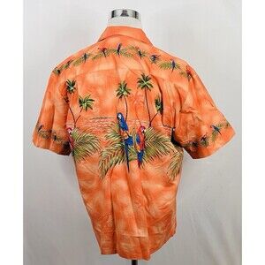 Ky's Large Vintage USA Made Hawaiian Aloha Shirt Parrots Palm Trees Orange