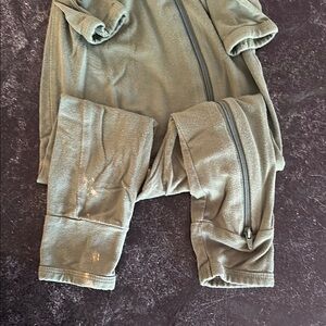 One small bleach stain from washing machine on left ankle of Hunter onesie, as pictured.
