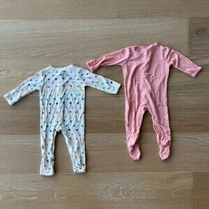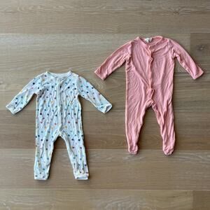 2 Kyte Baby snap rompers/pajamas. One is footed and the other footless. Both are a size 3-6 months and in preowned condition. Minor wash wear. There is light staining around the neck of the white one and two very small spot near the neckline of the pink one.