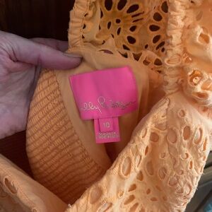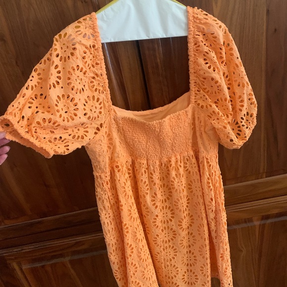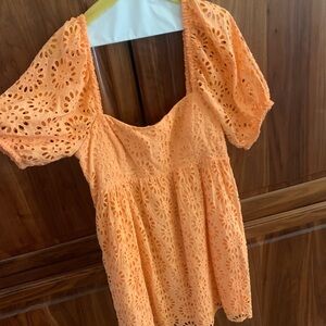 Chic orange eyelet top. Puffy sleeves. Square neckline. Perfect for summer.