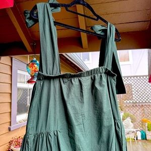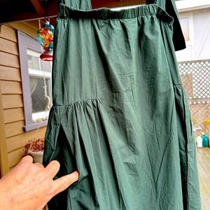 NWOT. Never worn. This dress is stunning! I bought a few pieces from this boutique that featured local artists in Cape Town, South Africa. Never worn this even though I think it’s amazing. So going to pass it along to someone who will hopefully wear it with pride, SOUTH AFRICAN PRIDE!! This green color is just beautiful!! Pockets on both sides. Adjustable shoulder ties. No stretch. It’s a thicker material that feel’s very high quality. Guessing it’s 100% cotton. But no tags. Beautiful pleated details around rib area.