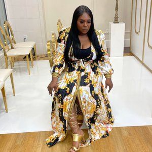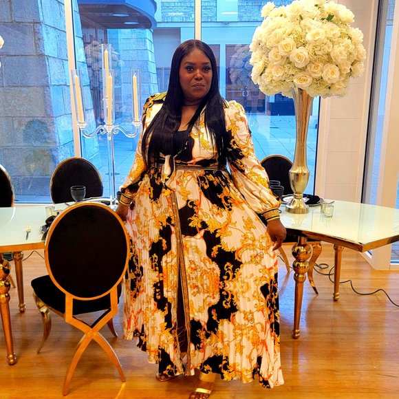 This beautiful L' ATISTE maxi dress is sure to be a show stopper whether you dress it casual or dress to impress. It's yellow gold black and white and size 1x. This dress is in great conditions, like new only wore once. material is 100% polyester