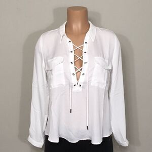 White silky 100% polyester lace up top. I love this brand they are made so well!