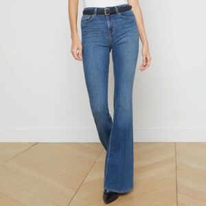 vintage-inspired bell-bottom jean in medium blue with classic fading and whiskering. Premium stretch denim in a light blue hue has a contoured waistband that fits securely around the natural waist as it smooths and slims, while the premium stretch denim hugs hip, thigh, and fitted through the knee before releasing into a sleek straight leg which can be altered up to 4" without drastically changing the shape.