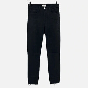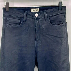 L' Agence Margot Skinny Metro Coated Jeans in Black - Size 28. Good pre-owned condition. They do have cut off hems. I'm not sure if this is factory or if the previous owner did it themselves. They have tons of stretch but measure small in my opinion for the tagged size. Please refer to measurements provided to ensure fit.
