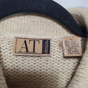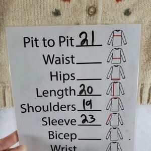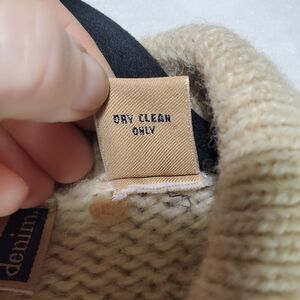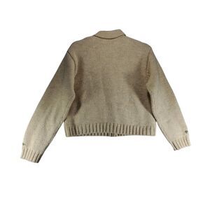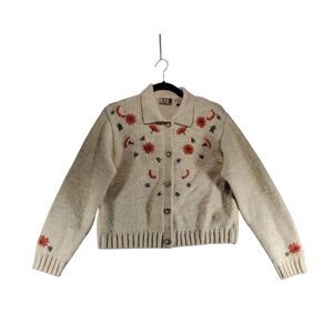 Size large cardigan by Ann Taylor Denim, flat measurements in photo #3. Wool, Alpaca and Acrylic Blend. Adorable button front cardigan with collar, 3D embroidered floral pattern. No stains or flaws noted, no holes.