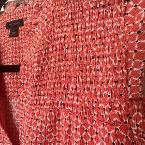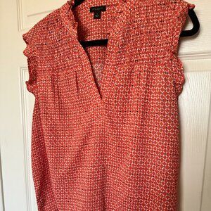 Orange Short sleeve blouse with ruffles. Fun Navy blue polka dots and a V neck to turn office wear to fun wear..
