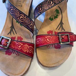The L'Artiste by Spring Step TANJA quarter strap sandal is a stylish French inspired, beautiful hand-painted premium leather asymmetrical sandal featuring a floral embossed pattern on each of the three different colored, adjustable hook and loop straps all on a cork-infused, comfort wedge.