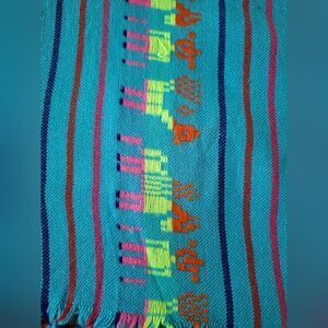 L blue poncho, bright pastel colors, 27" long w fringe detail, 58" wide, tribal, BOHO, llama design