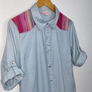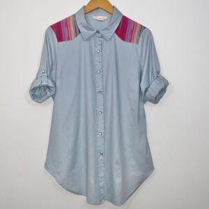 Band of Gypsies Long Sleeve Roll Tab Snap Button Up Fitted Chambray Denim Blouse with Shoulder Patches.