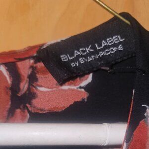 Large Black blouse with red flower detail. It fits more like a medium and non-stretch. Pleated design in the front and very cool material for the summer.