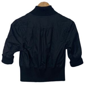 Large solid black jacket with snap button closure and side pockets , silver color metal accents