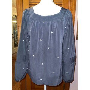 L C Lauren Conrad Dark Grey Heart Blouse -- L. This is a dark grey flowy square neck blouse with embroidered blue and white hearts, pleated sleeves adds interest to the balloon styled sleves. Measurements: Bust: 40"; Length: 20"; Sleeves: 26".