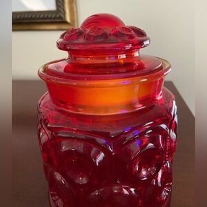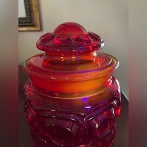 L E Smith Moon & Stars Amberina Glass Canister Red & Orange which GLOWS