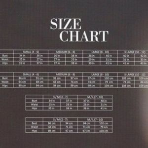 @whatshot Hi there. Thank you for your interest! The size chart is: SIZE LARGE: WAIST, BUST, HIPS-- 29, 38, 38 Inches. The bra fits cup size C-DD. When flat, the bust torso (ie the band of the bra) is 13 and 3/4 inches. The whole is is very stretchy lace. Just LMK if you have any other questions!