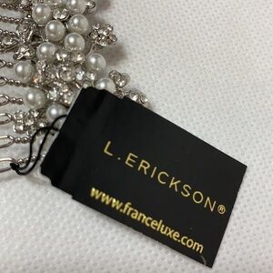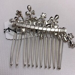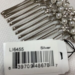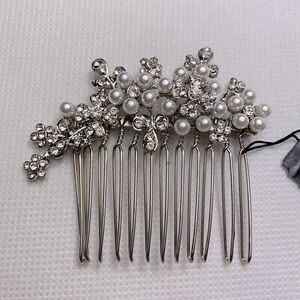 Glimmering floral crystals and luminous imitation pearls encrust an opulent, shining metal hair comb.