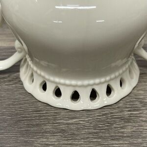 Add timeless charm to your tea table with this elegant ivory ceramic sugar bowl from L. Godinger & Co. Featuring twin handles, a domed lid with knob finial, and a stunning pierced lattice rim, this piece blends vintage sophistication with classic functionality.