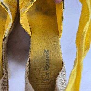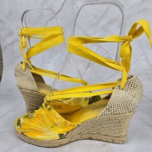 L. K. Bennett Size 40 (US 8.5) Yellow Lace Up Wedge Heels Floral Print Textile