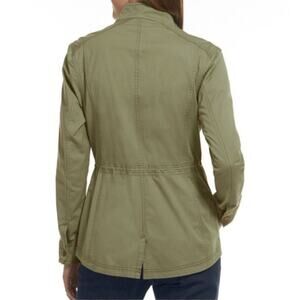 This jacket features a lightweight cotton shell with a zip and snap front closure, four front flap pockets for utility style, an adjustable drawstring waist for a flattering fit, and a soft inner lining for added comfort.