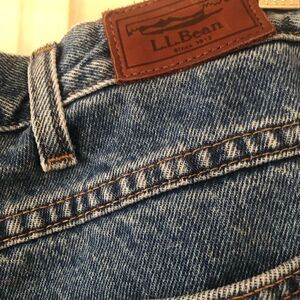 L L Bean men’s flannel lined 40x30 medium wash denim jeans. Item ID 139426. Belted. 5 pocket. Preowned. Small pull on left leg