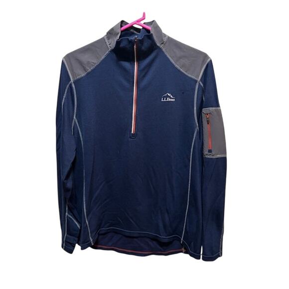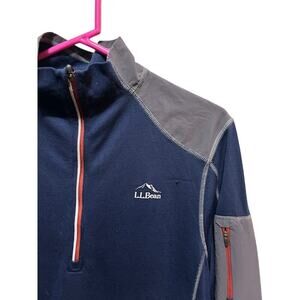 L. L. Bean Merino Wool Performance 1/4 zip Mid-weight Base Layer Blue and gray Men's Medium slightly fitted and in EUC see pics for condition confirmation and measurements. Perfect for hiking, biking, camping, outdoors.