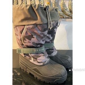 L L Bean Green Camo Snow boots 101301 Knee High Front Hook & Loop Waterproof Wool Lined Adjustable Front Strap. Slip On Youth 6 Women’s 8. Excellent Preowned Condition.