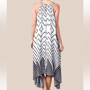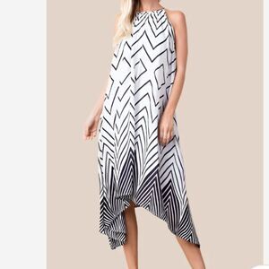 In excellent condition! Sophisticated handkerchief hem geometric print midi dress. Halter neck. Lined. Excellent for special occasion evening.