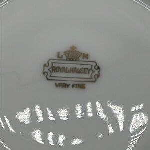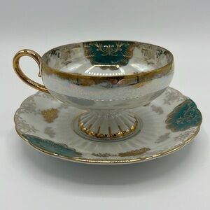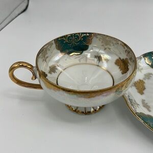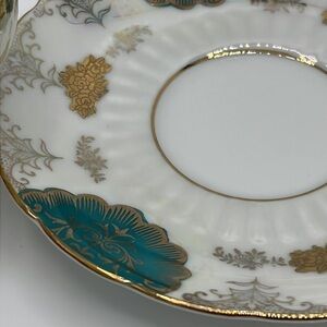 L M ROYAL HALSEY VERY FINE CHINA TEA CUP AND SAUCER SET GOLD, TEAL & IRIDESCENT