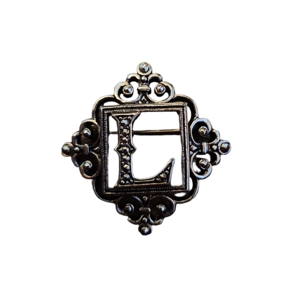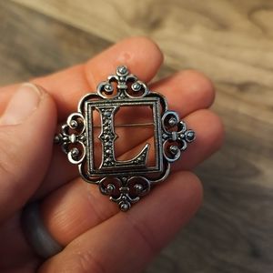 This vintage metal L pin is in excellent pre-owned condition. It is a pewter silver color with pretty scroll detailing. I did not see any stamps or brand on it.