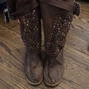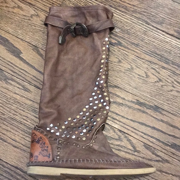 Mocassin studded boots from Italy.... they are an amazing soft leather studded boots ... bought in Italy EVERYONE was wearing them with skinny jeans shorts and even fun dresses. Slouch down for a cool vibe and wear up high ...
