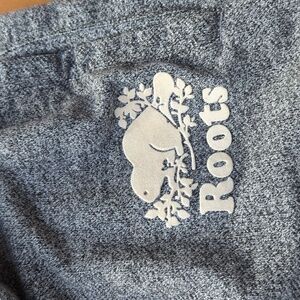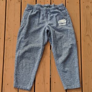 Men's size large Roots sweatpants, EUC. Some minor pilling on outer crotch seam. Note the length, these would fit a shorter frame best, if you prefer full length. Heathered gray, two hand pockets, elastic waistband and drawstring.