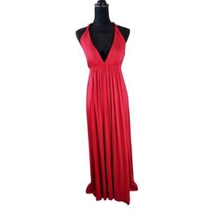 Women's Maxi Dress by L Signature has a deep v-neckline, sleeveless, padded bra, razor back, in a vivid color of Red. It has a fitted bodice with a flowy skirt and long drape. Ideal for Formal or a night out on the town. It's super soft and has a nice stretch.
