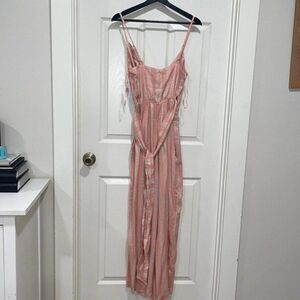 Spaghetti strap v-neckline jumpsuit. Tie knot detail in front—ankle-length pants. Soft and flowy printed fabric.