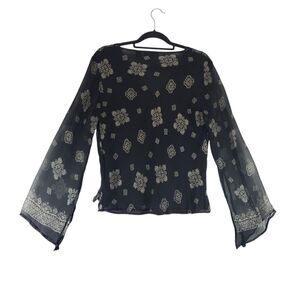 L Silk Bell Sleeve Surplice Wrap Blouse Babydoll Y2K 90s Style Sheer Top Shirt