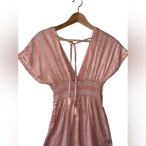 100% viscose. Made in India. Dry clean only. Back tassel tie closure with smocked back panel. Side seam pockets. Sheen finish.
