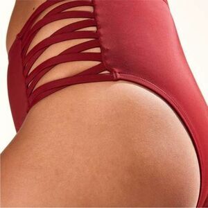 High waisted bikini bottom with crisscrossing strap details along each hip.