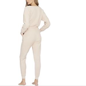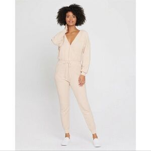 Leg, slim cut, joggers, pantsuit joggers, ribbed, neutral, beige, tan, sand, deep v-neck, revolve, Nordy, all season, comfortable, comfy, one piece, jumpsuit