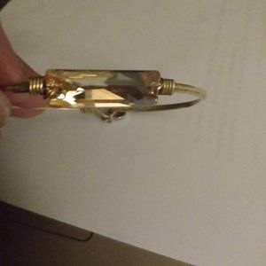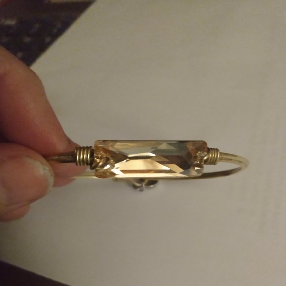 Copper bracelet with hook and a rectangle shape smokey quartz rhinestone on top. It has a tiny designer logo charm on bracelet back closure.