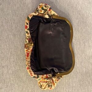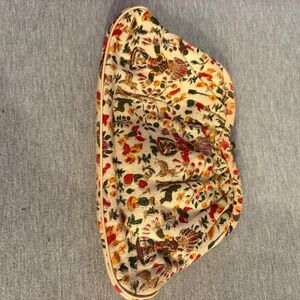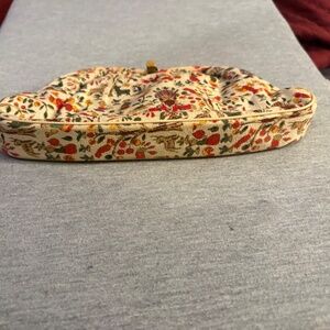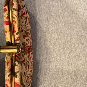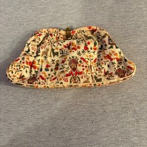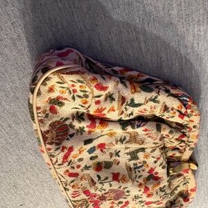 This is a nice tapestry small bag with all types of pictures on it. The bag has a latch closure on top and two separate sides inside for storage. The bag is 9 inches wide and 5.5 inches wide. The bag is in good condition.