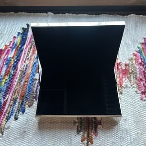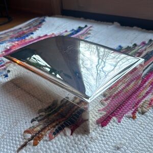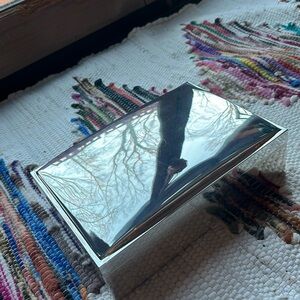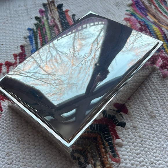 Vintage, silver plated, black velvet lined interior jewelry box with monogrammed “L” on lid by Pottery Barn.Perfect, estate wedding, birthday, anniversary, graduation, sweet 16 gift. “Old money”, “shabby chic. Silver has some spots, some minor scratching and normal wear on this piece. Overall in GREAT shape and has a perfect , estate, vintage, classic era piece that will age well. Approx 10”x 7”, pottery barn stamp on bottom. Personalized. Hand me down.