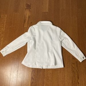 L stretchy waffle geometric square raised grid fabric white collar with drawstrings long sleeve with button on sleeves two front pockets jacket Christopher banks