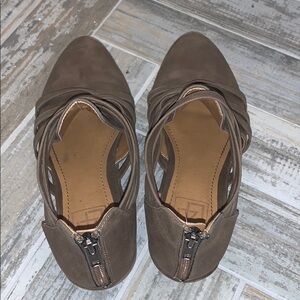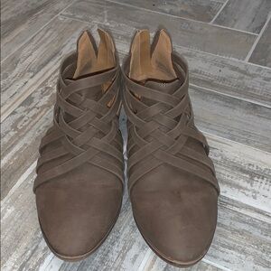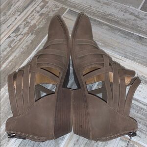 Excellent Preowned condition. Natural khaki color ankle boots with cut outs. Zipper back. Perfect for spring. Great with dresses or jeans