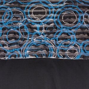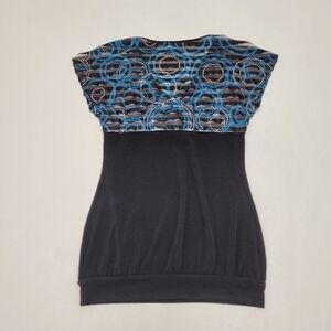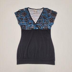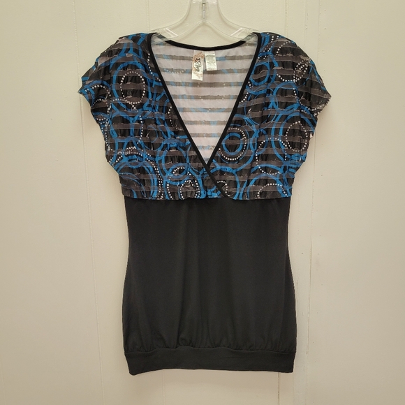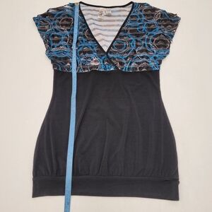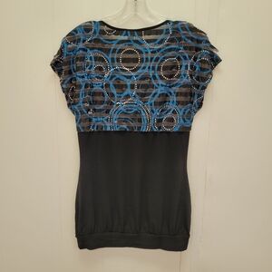 L8teR sublimated ruffle tunic top. Cap sleeves, V-neck, sublimated ruffle on top part, solid black fabric on bottom part, color blue/black, size M, never been worn. NWOT