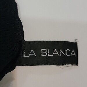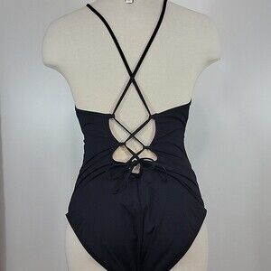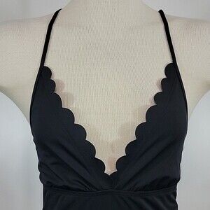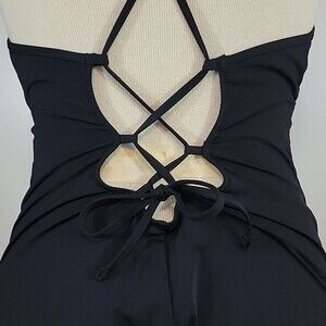 Pre-owned La Blanca Petal Pusher one piece black swimsuit size 10. Deep V scalloped edge neckline with crisscross strappy tie back.